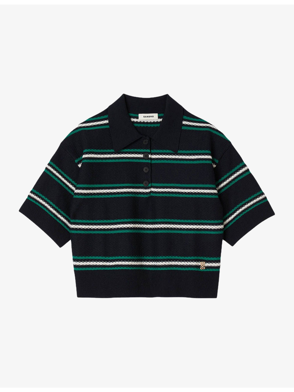 PRODUCT DETAILS - Sandro knitted top - 74% viscose, 14% polyester, 12% linen - Button fastening - Relaxed fit, polo collar, short sleeves, stripe knit pattern, ribbed trims - Machine wash cold - True to size - Model is 5ft 10in/1.78m and wears a size UK 8 - Lightweight, stretchy Ref: R04490599