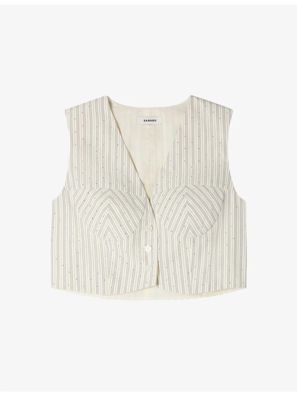 PRODUCT DETAILS - Sandro woven top - 63% polyester, 37% cotton - Button fastening - Regular fit, V-neck, sleeveless, all-over striped pattern, all-over rhinestone embellishment, cropped - Hand wash - True to size - Model is 5ft 11in/1.80m and wears a size UK 8 - Lightweight, non-stretch Ref: R04578716