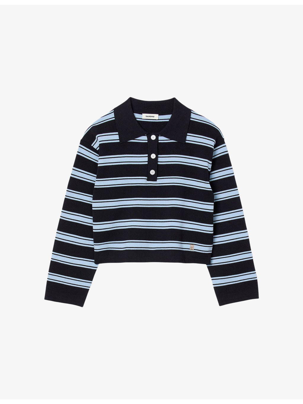 PRODUCT DETAILS - Sandro knitted polo sweater - 77% cotton, 12% silk, 11% linen; collar 61% cotton, 17% polyamide, 11% silk, 9% linen, 2% elastane - Button fastening at front - Spread collar, long sleeves, all-over striped pattern, ribbed trims, - Hand wash - True to size - Lightweight, slight stretch Ref: R04490571