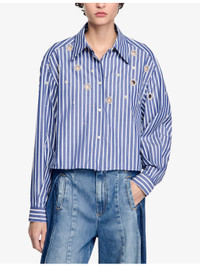 PRODUCT DETAILS - Sandro cotton shirt - 100% cotton - Button fastening - Regular fit, collar, long sleeves, round cut-outs, rhinestone and faux-pearl embellishments, all-over striped pattern - Dry clean - True to size - Lightweight, non-stretch Ref: R04411945