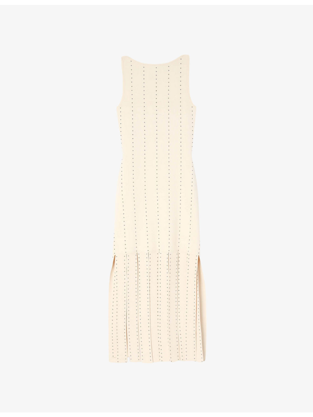PRODUCT DETAILS - Sandro stretch-woven maxi dress - 52% viscose, 46% polyamide, 2% elastane; fringing 62% viscose, 38% polyamide - Slim fit, boat neck, sleeveless, all-over stud-embellished vertical lines, fringing from thigh to hem, maxi length - Hand wash - True to size - Lightweight, slight stretch Ref: R04490619
