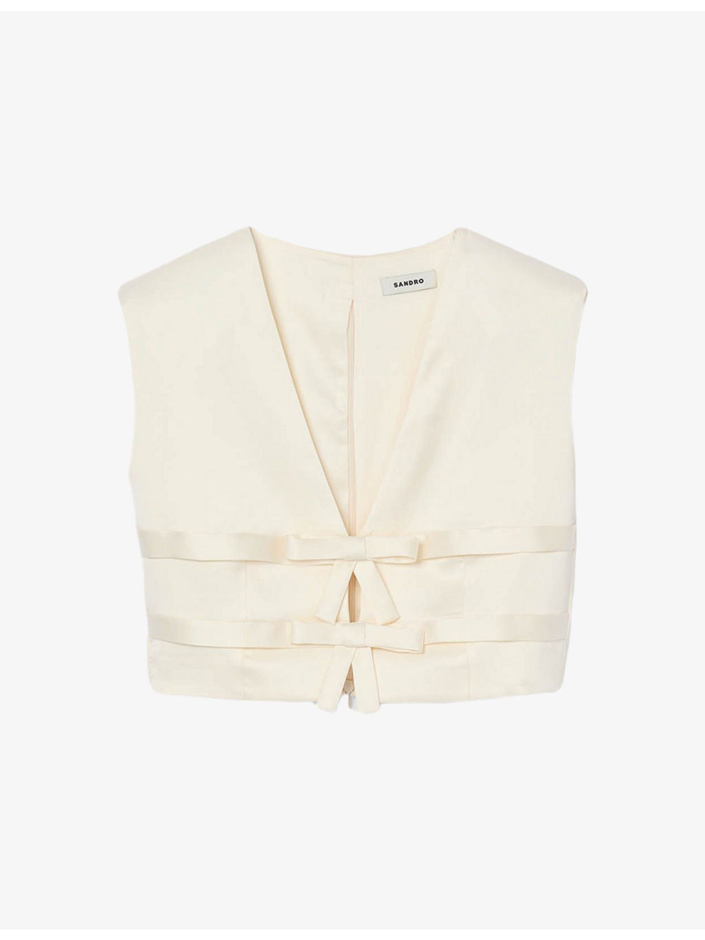 PRODUCT DETAILS - Sandro satin top - 97% polyester, 3% elastane - Self-tie fastening - Regular fit, V-neck, tie detail at the front, cropped - Hand wash - True to size - Model is 5ft 10in/1.78m and wears a size UK 8 - Midweight, slight stretch Ref: R04501133