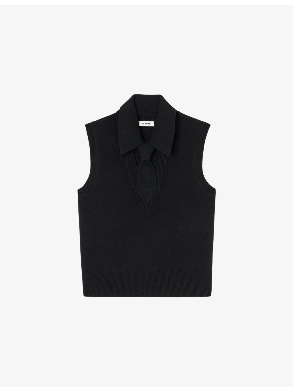 PRODUCT DETAILS - Sandro stretch wool-blend jumper - 90% wool, 9% polyamide, 1% elastane - Regular fit, classic collar with tie, sleeveless, ribbed trim - Hand wash - True to size - Model is 5ft 9in/1.75m and wears a size UK 8 - Midweight, slight stretch Ref: R04502924