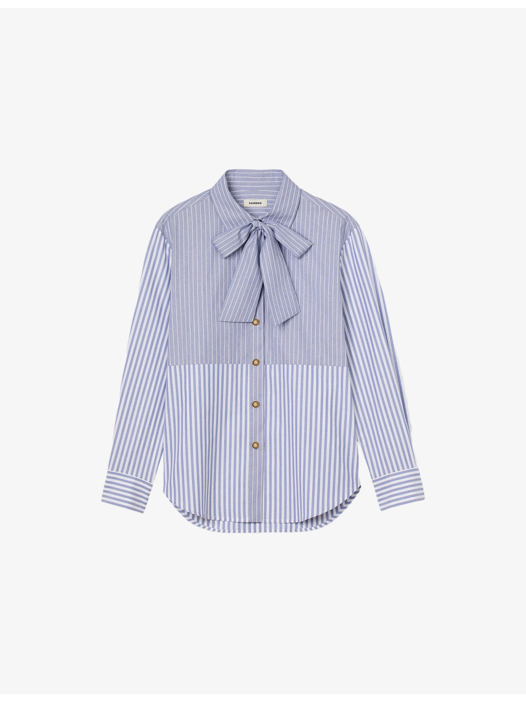 PRODUCT DETAILS - Sandro cotton shirt - 100% cotton - Exposed button fastening at front - Regular fit, tie neck detail, long sleeves, stripe finish - Machine wash at 30°C - True to size - Model is 5ft 9in/1.75m and wears a size UK 8 - Lightweight, non-stretch Ref: R04512058