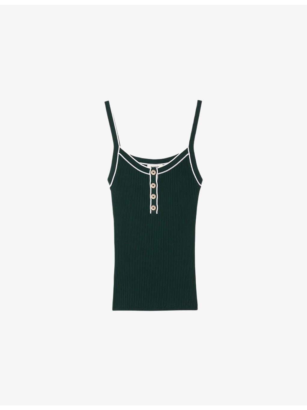 PRODUCT DETAILS - Sandro knitted vest - 53% viscose, 27% lyocell, 14% polyamide, 6% silk - Exposed button fastening at front - Slim fit, scoop neck, contrast trim, button-down design, ribbed finish - Hand wash - True to size - Model is 5ft 10in/1.78m and wears a size UK 8 - Midweight, non-stretch Ref: R04490537