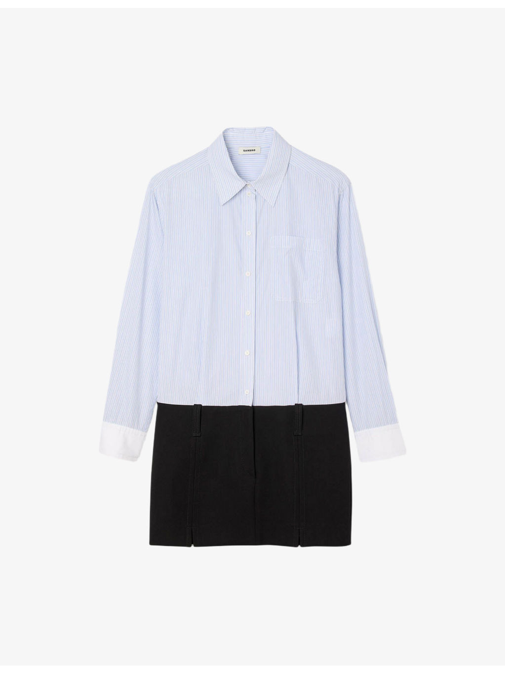 PRODUCT DETAILS - Sandro cotton dress - 100% cotton - Exposed button fastening at front - Regular fit, two-tone design, shirt collar, long sleeves, belt loops, contrast mini skirt, branding at the back - Dry clean - True to size - Model is 5ft 9in/1.75m and wears a size UK 8 - Midweight, non-stretch Ref: R04501138