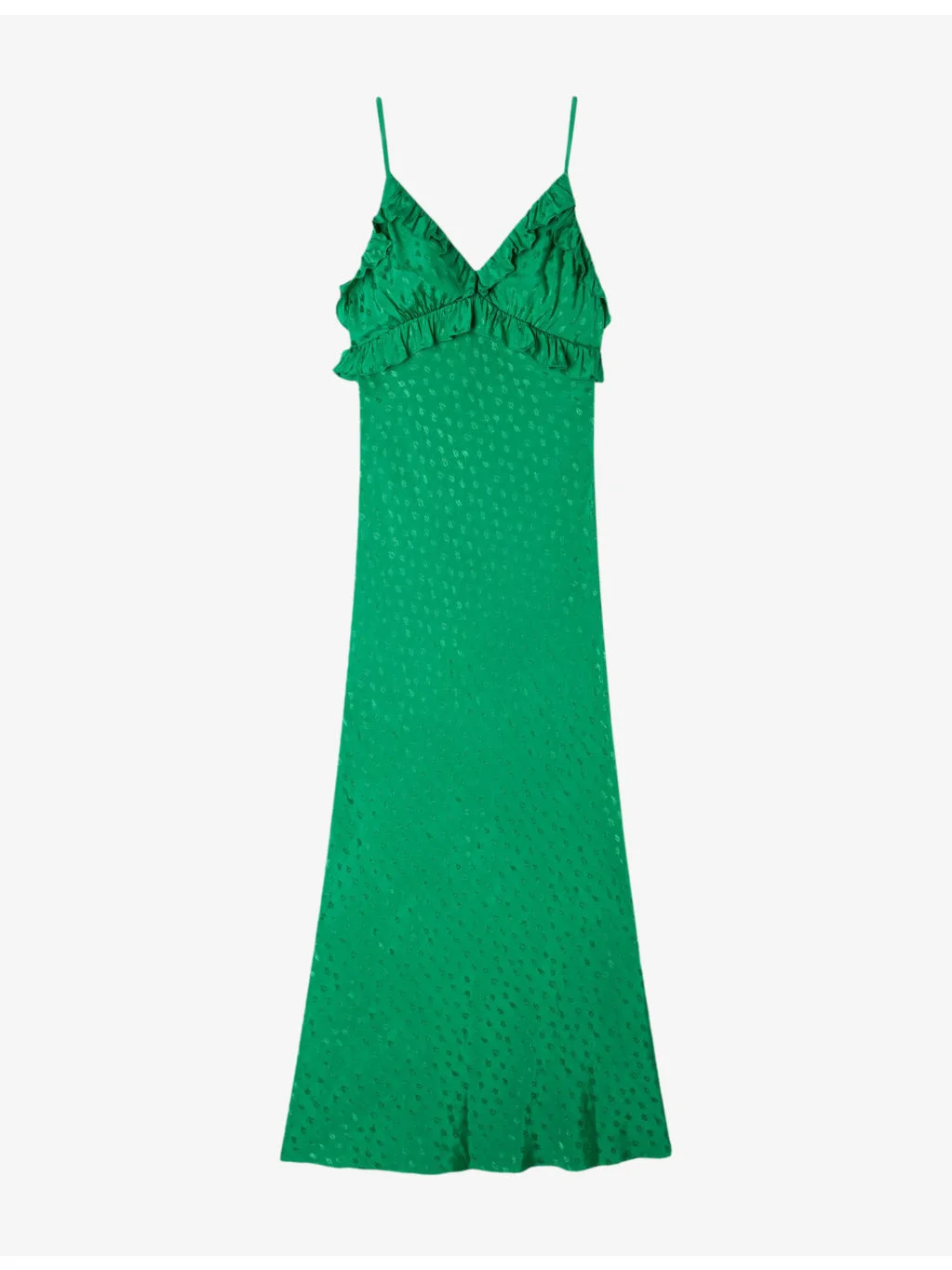 PRODUCT DETAILS - Sandro woven maxi dress - 100% viscose - Zip fastening - Regular fit, V-neck, straps, sleeveless, ruffle trim, all-over jacquard pattern - Dry clean - True to size - Lightweight, non-stretch Ref: R04598456