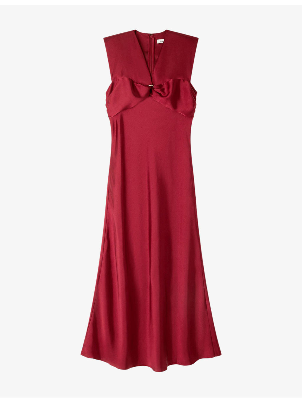 PRODUCT DETAILS - Sandro satin maxi dress - 100% polyester - Concealed zip fastening at back - V-neck opening, sleeveless, gathered detailing at back, draped detailing at front, gold-toned hardware, flare cut skirt - Dry clean - Made in Tunisia - True to size - Lightweight, non-stretch Ref: R04501114