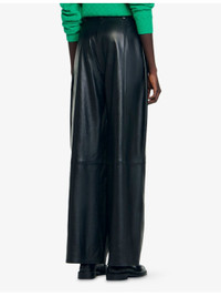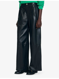 PRODUCT DETAILS - Sandro leather trousers - 100% lambskin leather - Exposed button and zip-fly fastening - Relaxed fit, high rise, belt loops, two pockets at the side, wide leg - Specialist leather clean - True to size - Model is 5ft 9in/1.75m and wears a size UK 8 - Midweight, non-stretch Ref: R04501211