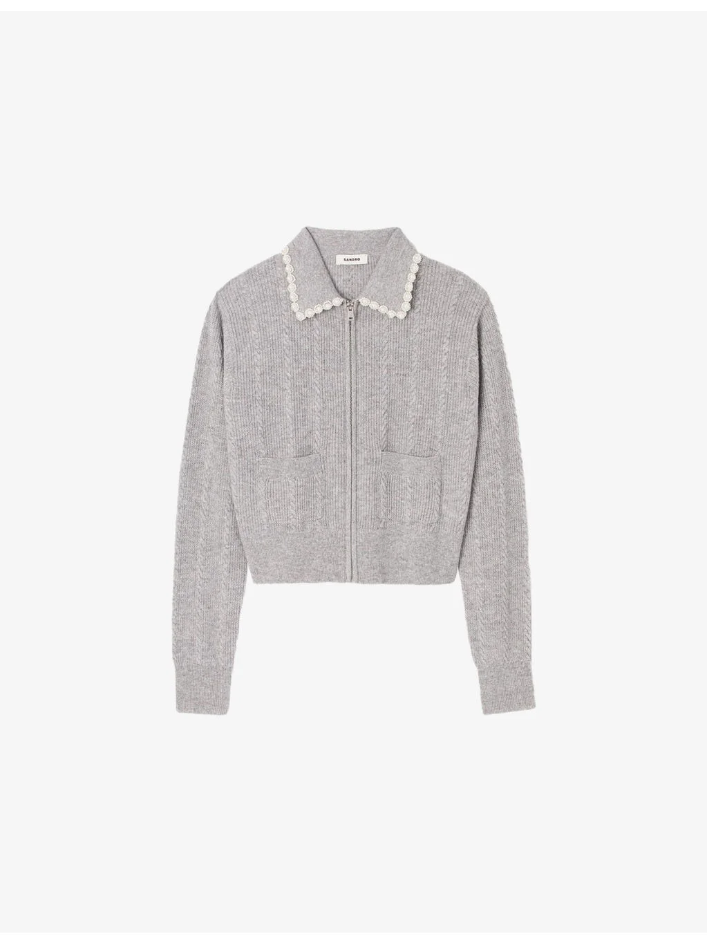 PRODUCT DETAILS - Sandro wool and cashmere-blend cardigan - 95% wool, 5% cashmere - Exposed zip fastening at front - Regular fit, collar with bead embellishment, long sleeves, two pockets at the side, ribbed trims - Hand wash - True to size - Model is 5ft 9in/1.75m and wears a size UK 8 - Midweight, non-stretch Ref: R04501262