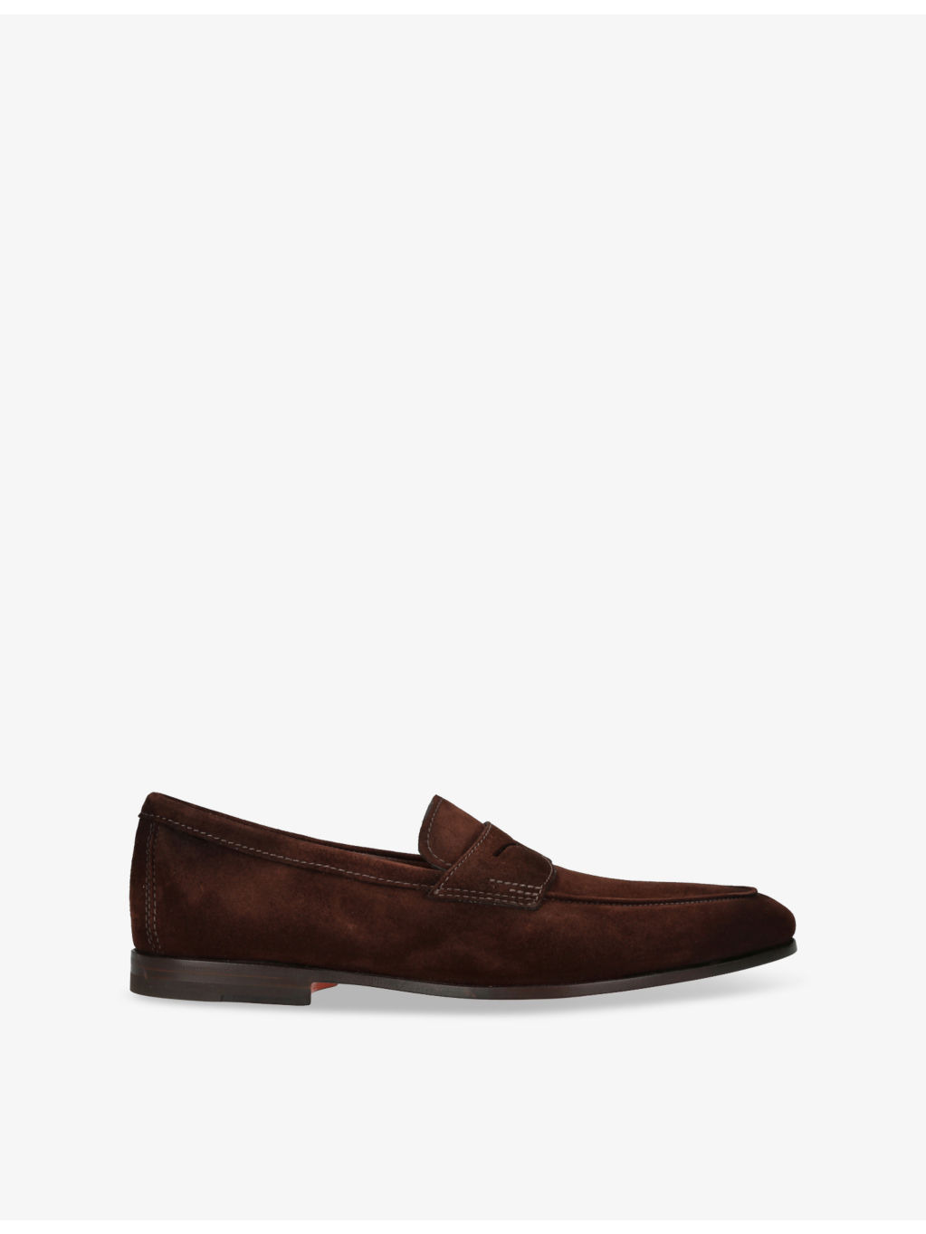PRODUCT DETAILS - Santoni suede loafers - 100% suede - Slips on - Almond closed toe, apron stitching, raised borders, penny detail to the front, branded insole - Specialist leather clean - Upper: 100% suede - Lining: 100% leather - Sole: 100% leather Ref: R04529657