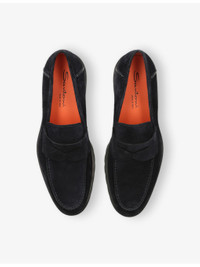 PRODUCT DETAILS - Santoni suede loafers - 100% suede - Slips on - Almond closed toe, apron stitching, contrast stitch detail at side, penny detail at the front, branded insole, contrasting sole - Specialist leather clean - Made in Italy - Upper: 100% suede - Lining: 100% leather - Sole: 100% rubber Ref: R04473802