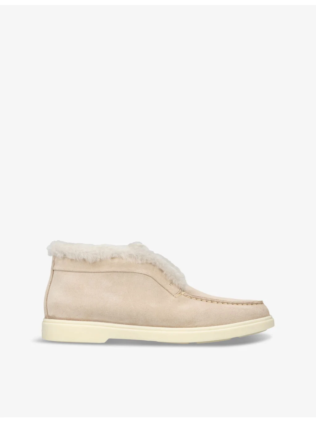 PRODUCT DETAILS - Santoni suede ankle boots - 100% leather - Slips on - Round toe, faux-fur edging, embossed branding at back - Specialist leather clean - Upper: 100% leather - Made in Italy - Lining: 100% leather - Sole: 100% rubber Ref: R04392632