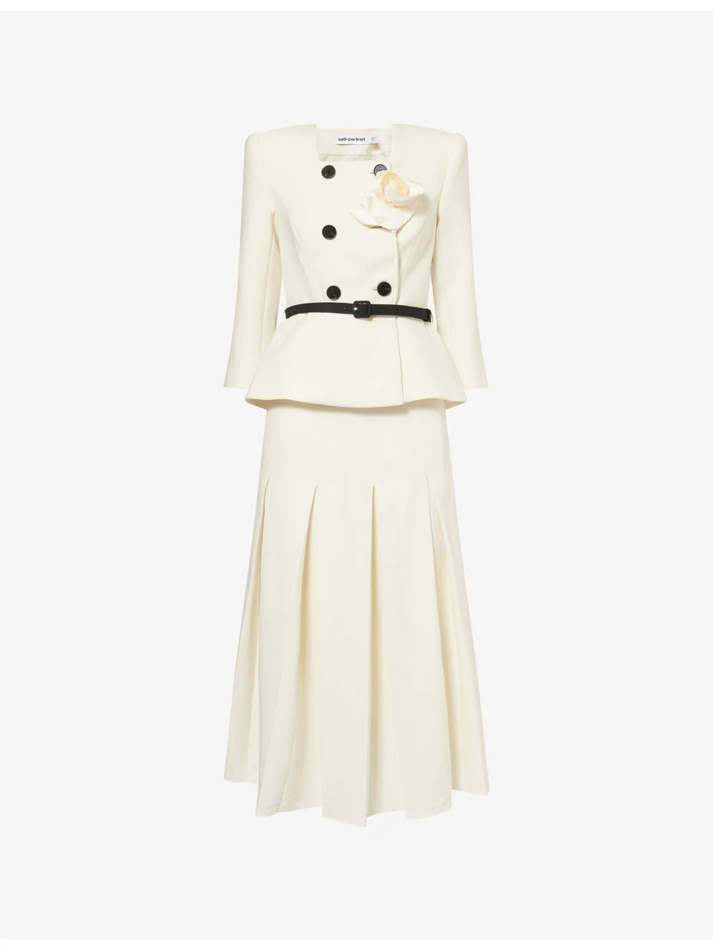 PRODUCT DETAILS - Self-Portrait wool-blend midi dress - 38% wool, 29% polyester, 27% viscose, 6% elastane; lining 100% polyester - Exposed button fastenings at front - Slim fit, double-breasted, square neck, padded shoulders, belted waist, sculptural floral corsage, pleated skirt, midi length - Dry clean - True to size - Size UK 8: length 49in / 125cm - Model is 5ft 10in/1.78m and wears a size UK 8 - Midweight, non-stretch Ref: R04584331