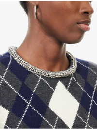 PRODUCT DETAILS - Self-Portrait wool jumper - 100% wool; trims 95% wool, 4% polyamide, 1% elastane - Concealed hook-and-eye fastening at back - Regular fit, crystal embellished round-neck, padded shoulders, long sleeves, argyle print at front and back, all-over knitted, ribbed trims - Dry clean only - True to size - Model is 5ft 10in/1.78m and wears a size small - Midweight, stretchy Ref: R04571662