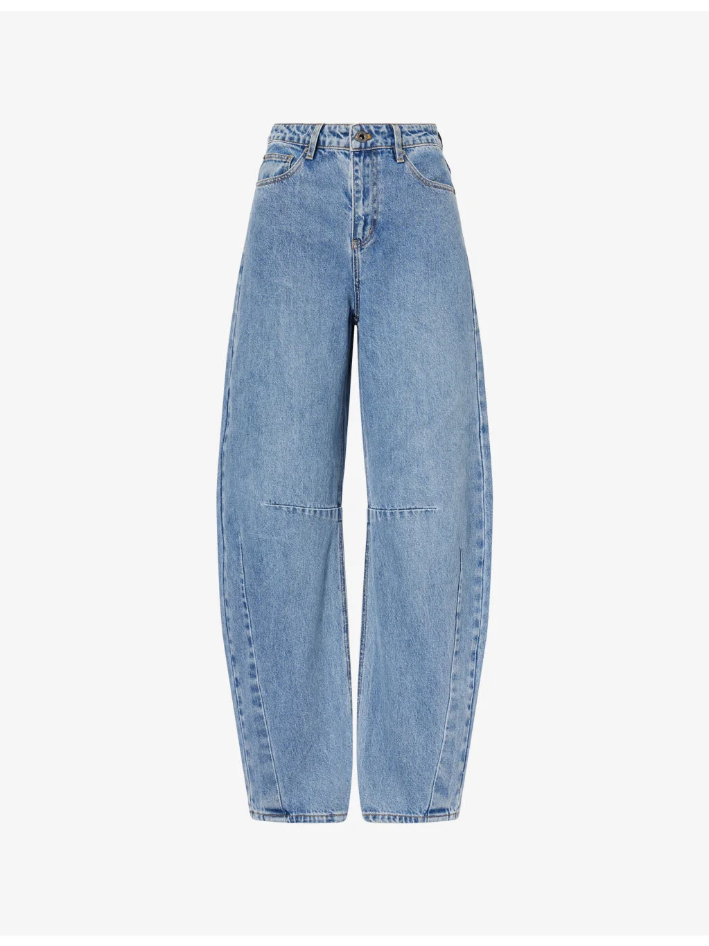PRODUCT DETAILS - Self-Portrait denim jeans - 100% cotton; pocketlining 70% polyester, 30% cotton - Exposed button and concealed zip-fly fastening at front - Relaxed fit, high-rise, barrel leg, belt loops, five pockets, brand embroidery and brand tab at back, faded wash - Dry clean - True to size - Size 26: rise 13in / 34cm, inside leg 31in / 80cm, leg opening 16in / 41cm - Model is 5ft 10in/1.78m and wears a size 26 - Midweight, slight stretch Ref: R04571657