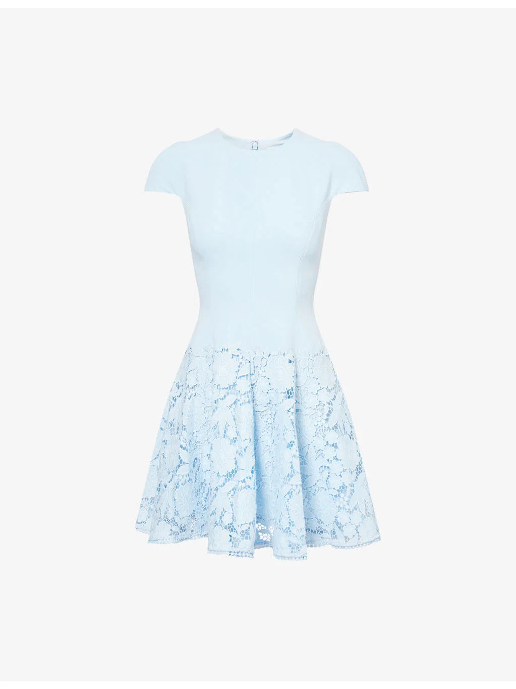 PRODUCT DETAILS - Self-Portrait crepe and lace mini dress - 100% polyester - Concealed zip fastening at back - Regular fit, short cap sleeves, high round neck, fitted bodice, lace skater skirt, scallop lace hem, lining - Dry clean - True to size - Size UK 8: length 34in / 87cm - Model is 5ft 10in/1.78m and wears a size UK 8 - Midweight, non-stretch Ref: R04584352