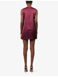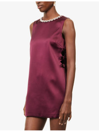 PRODUCT DETAILS - Self-Portrait satin mini dress - 100% polyester; lining 100% polyester - Concealed zip fastening at back - Relaxed fit, round neck, crystal chain embellishment at neck, sleeveless, cut-outs at side, bow motifs at side, mini length, satin finish, fully lined - Dry clean only - True to size - Size UK 8: length 32in / 81.5cm - Model is 5ft 10in/1.78m and wears a size UK 8 - Midweight, non-stretch Ref: R04548917
