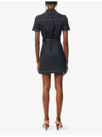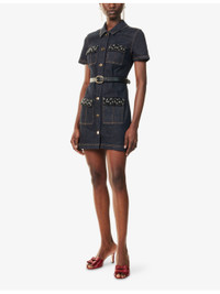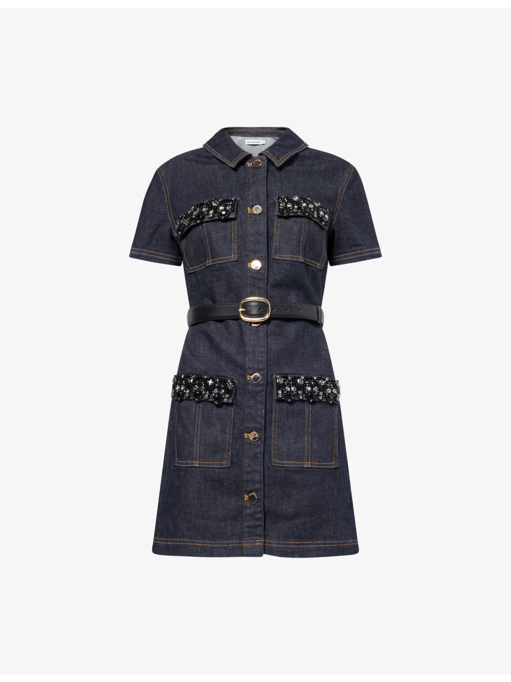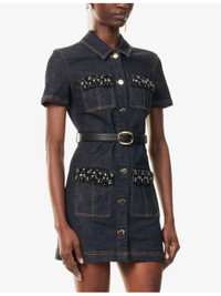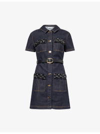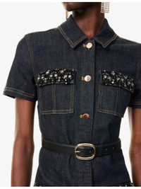 PRODUCT DETAILS - Self-Portrait stretch-denim blend mini dress - 94% cotton, 5% polyester, 1% elastane; belt 100% cow leather; coating 100% polyurethane - Exposed button fastening at front - Slim fit, spread collar, short sleeves, four buttoned pockets and crystal embellishment at front, belt loops, detachable belt, flared hem - Dry clean only - True to size - Size UK 8: length 32in / 82cm - Model is 5ft 10in/1.78m and wears a size UK 8 - Midweight, stretchy Ref: R04509628