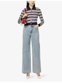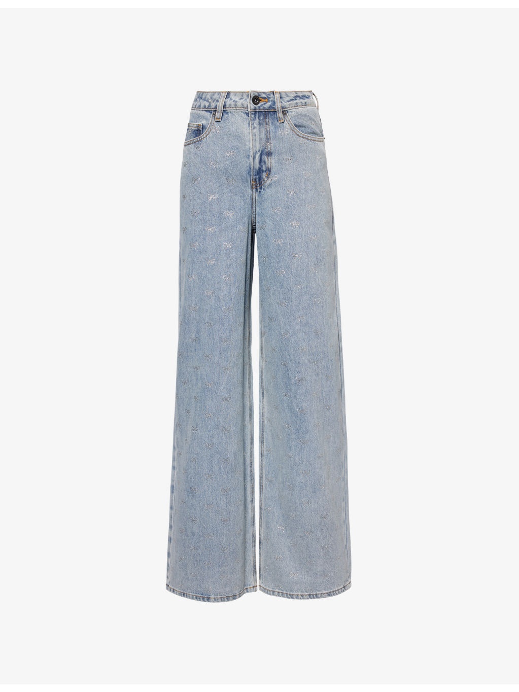 PRODUCT DETAILS - Self-Portrait denim jeans - 100% cotton - Exposed button and concealed zip-fly fastening at front - Regular fit, wide leg, high-rise, belt loops, five pockets, all-over bow rhinestone embellishment, V-shaped yoke at back, brand patch at back, - Dry clean only - True to size - Size 26: rise 12in / 30.5cm, inside leg 33.5in / 85cm, leg opening 24in / 61.5cm - Model is 5ft 10in/1.78m and wears a size 26 - Midweight, non-stretch Ref: R04470245