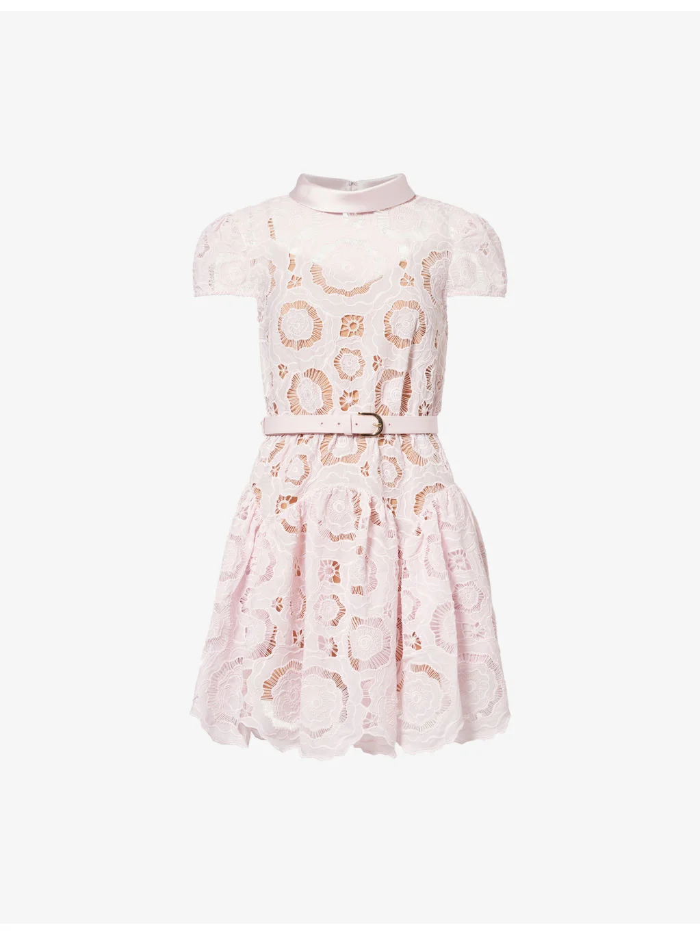 PRODUCT DETAILS - Self-Portrait woven mini dress - 100% polyester; belt 100% polyester; embroidery 100% polyester - Concealed zip fastening at back - Regular fit, folded satin round-neck, puffed cap-sleeves, elasticated waistband, detachable belt, two slip pockets at front, all-over cut-out floral lace embroidery, detachable contrast lining, flared scalloped hem - Dry clean only - True to size - Size UK 8: length 32in / 82cm - Model is 5ft 10in/1.78m and wears a size UK 8 - Lightweight, stretchy Ref: R04571638