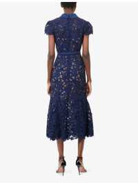 PRODUCT DETAILS - Self-Portrait woven midi dress - 100% polyester; belt 100% polyester; embellishments 100% polyamide; embroidery 100% polyester; lining 100% polyester - Concealed zip fastening at back - Slim fit, satin spread collar, cap sleeves, detachable belt, all-over guipure lace embroidery, detachable contrast lining, ruffled hem - Dry clean only - True to size - Size UK 8: length 49in / 125cm - Model is 5ft 10in/1.78m and wears a size UK 8 - Midweight, stretchy Ref: R04571639