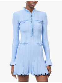 PRODUCT DETAILS - Self-Portrait knitted mini dress - 50% viscose, 32% polyester, 16% polyamide, 2% elastane; trims 62% viscose, 38% polyester - Concealed hook-and-eye fastening at front - Slim fit, V-neck, padded shoulders, long sleeves, split ruffled cuffs, four buttoned pockets at front, pearl embellished trims, all-over knitted and ribbed, flared hem - Dry clean only - True to size - Size small: length 30in / 77cm - Model is 5ft 10in/1.78m and wears a size small - Midweight, stretchy Ref: R04571661