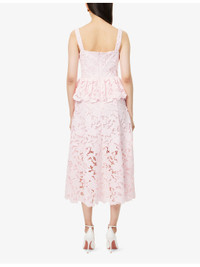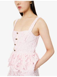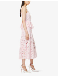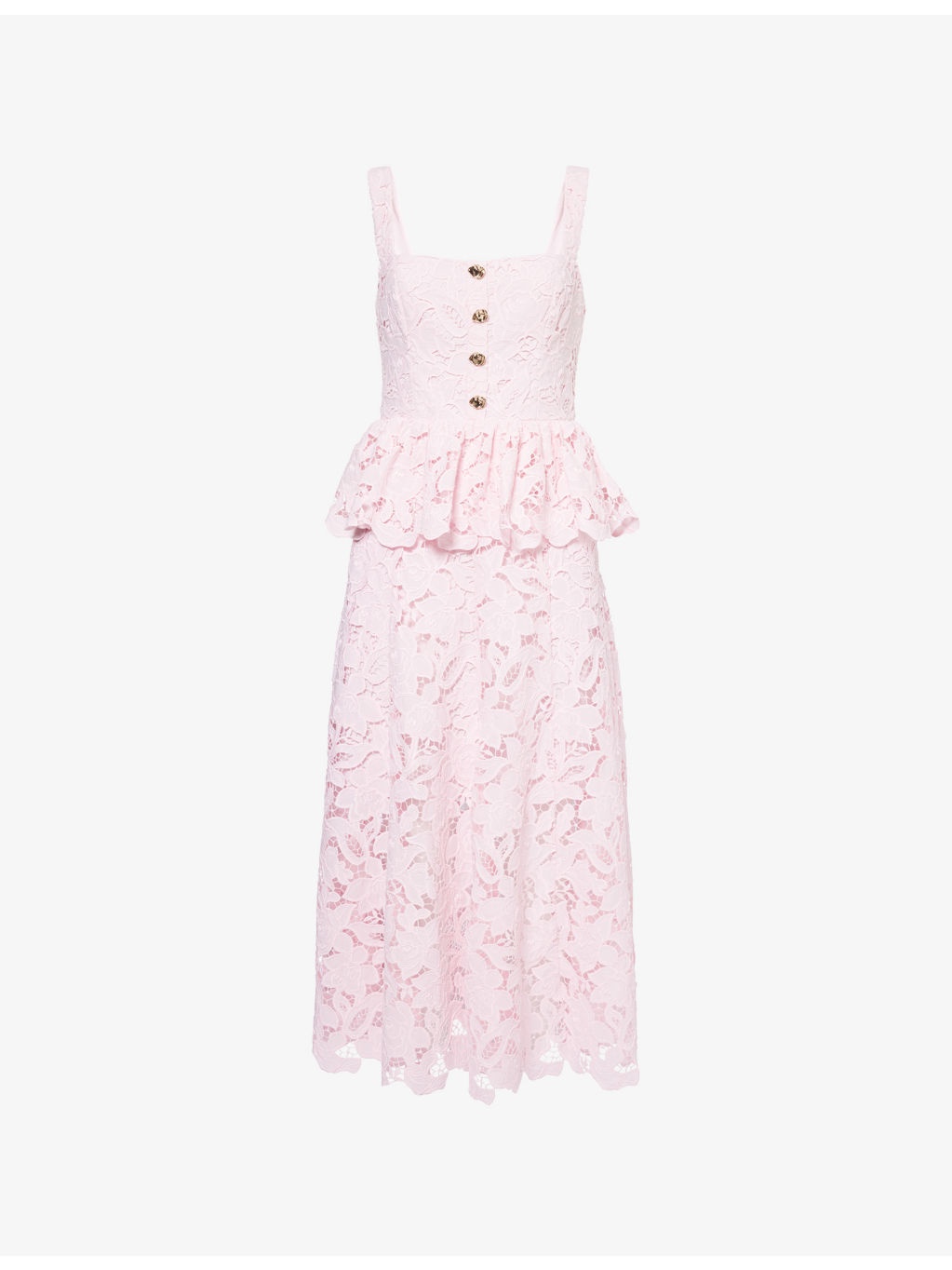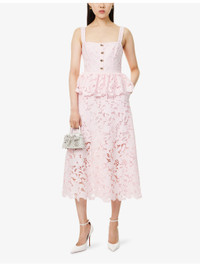 PRODUCT DETAILS - Self-Portrait woven midi dress - 100% polyester - Concealed zip fastening at back - Square neck, sleeveless, peplum design, gold-toned hardware, scallop trips, partially lined - Dry clean - True to size - Size UK 8: length 48.8in / 124cm - Model is 5ft 10in/1.78m and wears a size UK 8 - Midweight, non-stretch Ref: R04470228
