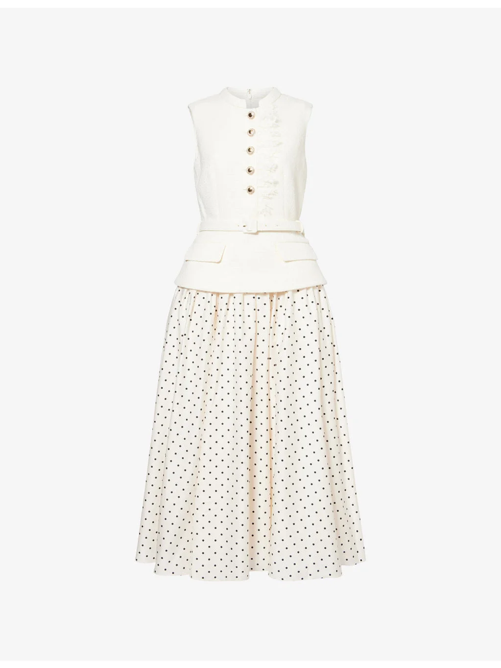 PRODUCT DETAILS - Self-Portrait boucle and cotton midi dress - 100% polyester; contrast 100% cotton; lining 100% cotton - Regular fit, round neck, sleeveless, boucle top, removable belt at waist, faux flap pockets at front, polkadot cotton skirt, crystal embellished buttons, fully lined - Dry clean - True to size - Size UK 8: length 51in / 129.5cm - Model is 5ft 10in/1.78m and wears a size UK 8 - Midweight, non-stretch Ref: R04584327