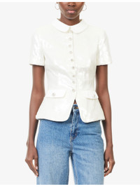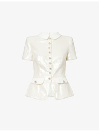 PRODUCT DETAILS - Self-Portrait woven top - 100% polyester; contrast 100% polyester; lining 100% polyester - Concealed zip fastening at back - Slim fit, peter-pan collar, padded shoulders, short sleeves, two buttoned pockets and crystal floral buttons at front, all-over sequin embellishment, fully lined, contrast crepe trims - Dry clean only - True to size - Size UK 8: length 22in / 56cm - Model is 5ft 10in/1.78m and wears a size UK 8 - Midweight, stretchy Ref: R04571652