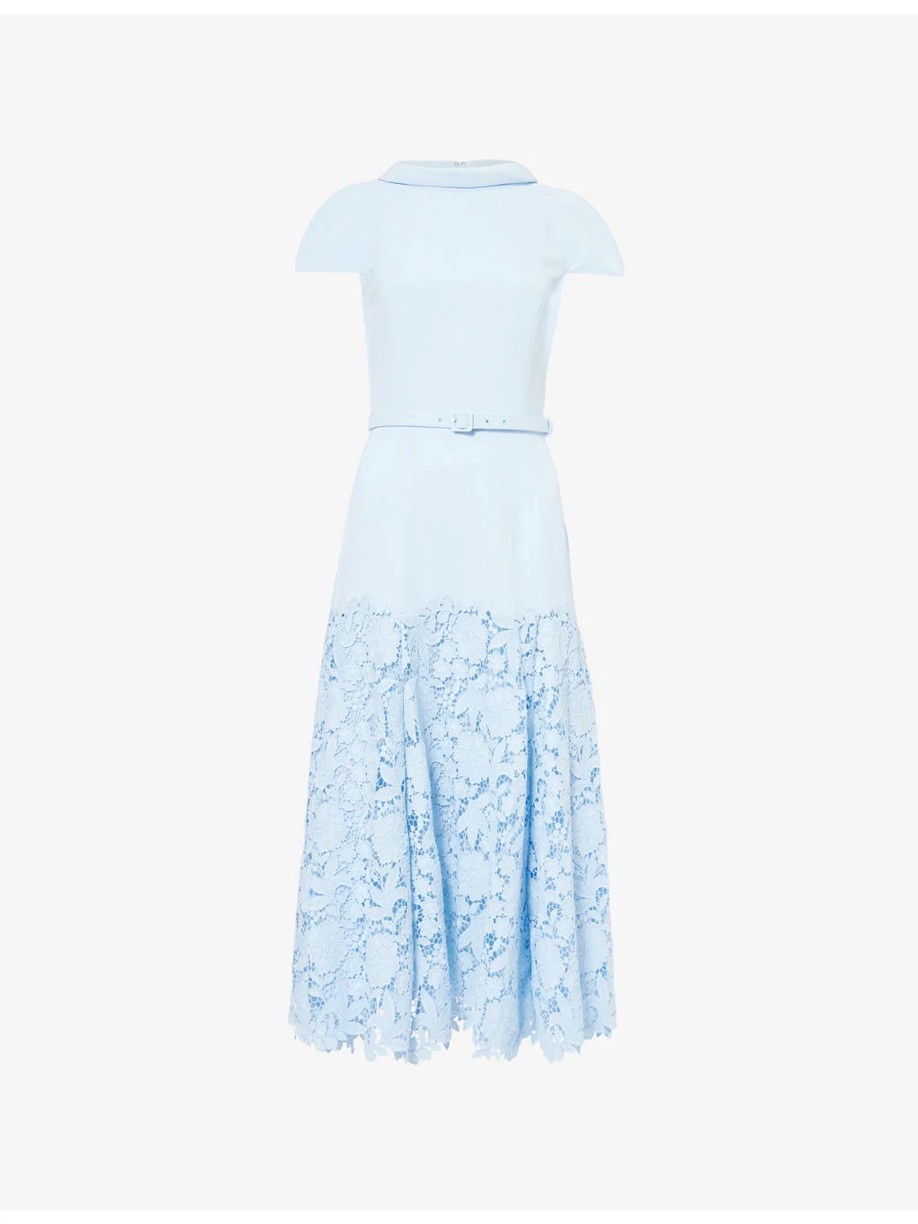 PRODUCT DETAILS - Self-Portrait crepe midi dress - 100% polyester; contrast 100% polyester - Concealed zip fastening at back - Slim fit, high neck, short sleeves, dropped waist, removable belt, floral lace skirt. scalloped hem, midi length - Dry clean - True to size - Size UK 8: length 51in / 130cm - Model is 5ft 10in/1.78m and wears a size UK 8 - Lightweight, non-stretch Ref: R04584333