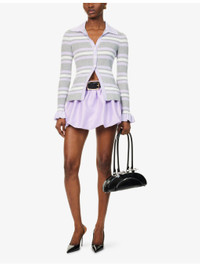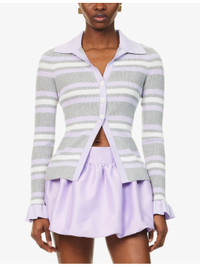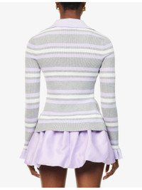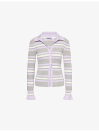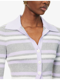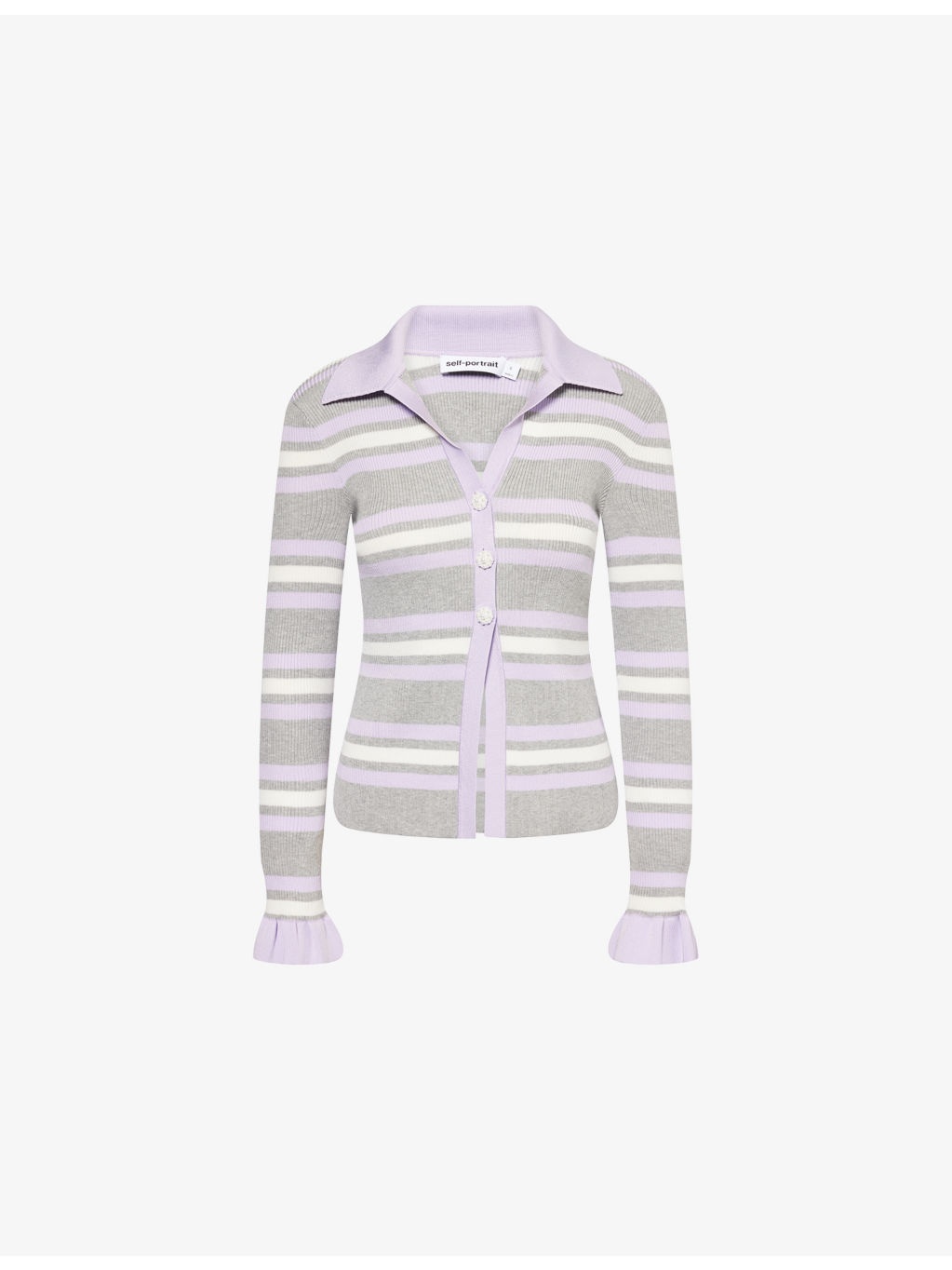 PRODUCT DETAILS - Self-Portrait knitted top - 53% viscose, 47% polyester; contrast 69% viscose, 20% polyester, 10% polyamide, 1% elastane - Exposed button fastening at front - Slim fit, V-neck, spread collar, long sleeves, all-over striped print, all-over knitted and ribbed - Dry clean - True to size - Size small: length 22in / 57cm - Model is 5ft 10in/1.78m and wears a size small - Midweight, stretchy Ref: R04470237