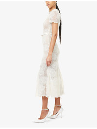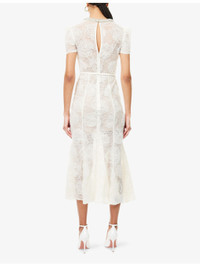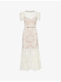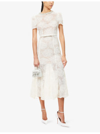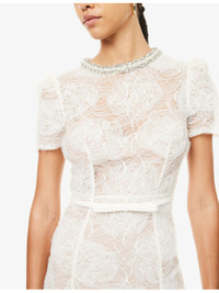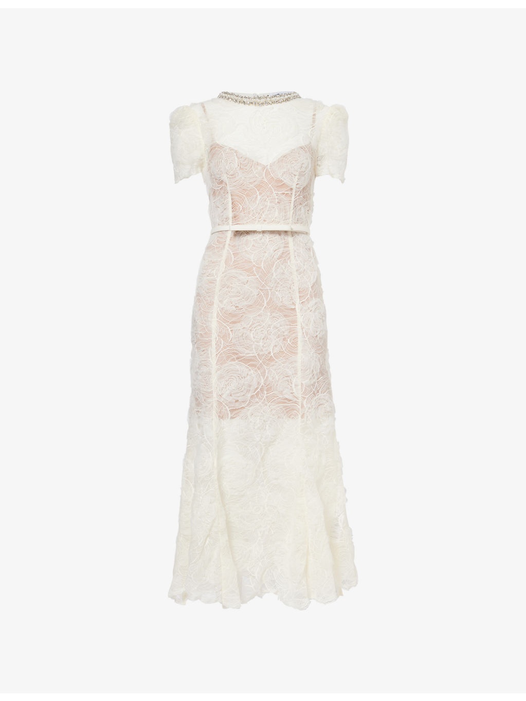 PRODUCT DETAILS - Self-Portrait lace midi dress - 100% polyamide - Concealed zip fastening - Slim fit, round neckline, crystal trim at neckline, short sleeves, lace pattern - Dry clean only - True to size - Model is 5ft 10in/1.78m and wears a size UK 8 - Lightweight, non-stretch Ref: R04470218