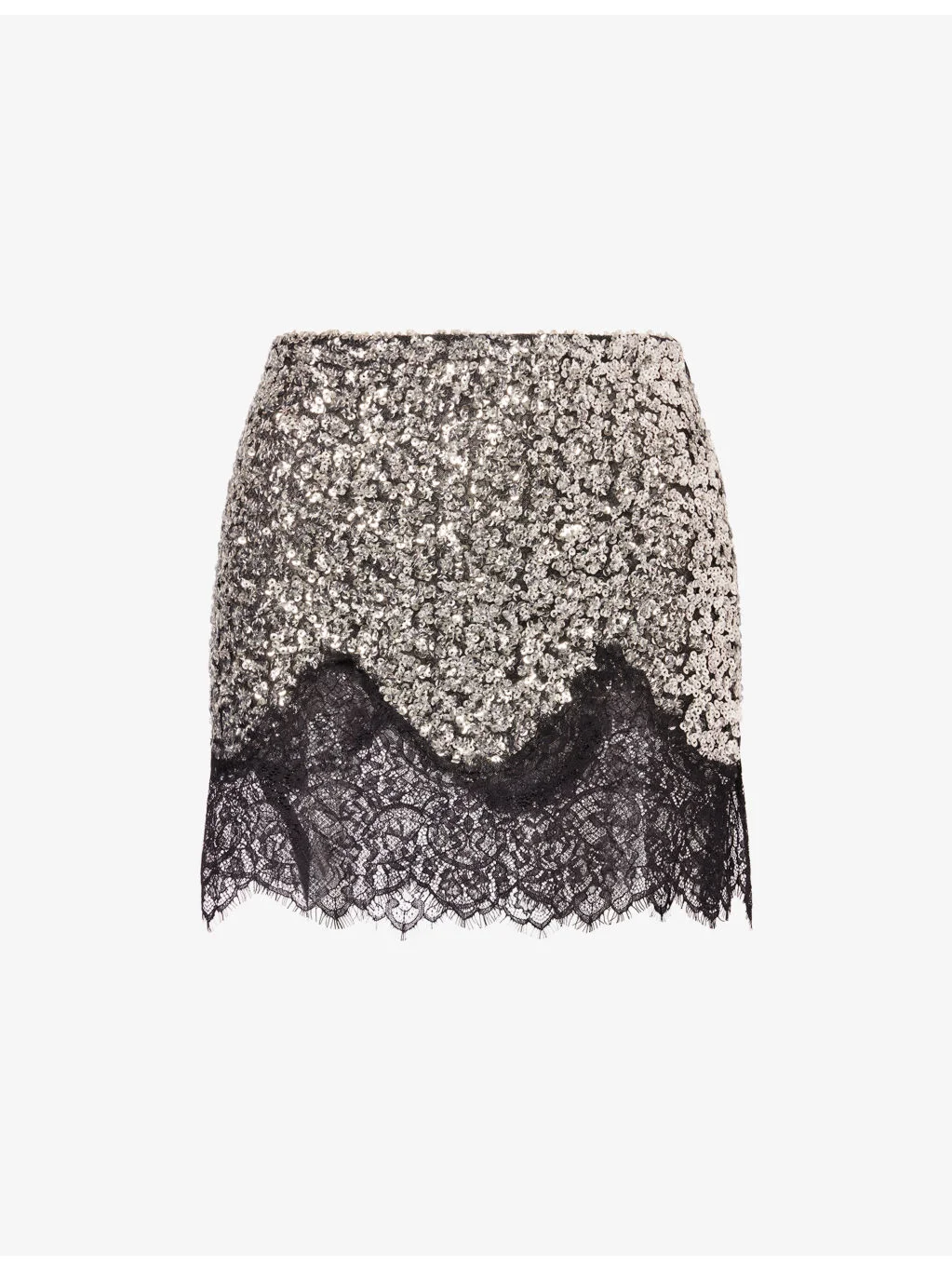 PRODUCT DETAILS - SIEDRES sequin mini skirt - 100% polyester - Concealed hook-and-eye and zip fastenings at back - Regular fit, mid-rise, all-over sequin embellishment, scalloped lace hem - Dry clean - True to size - Size UK 8: length 14in / 36cm - Model is 5ft 10in/1.78m and wears a size UK 8 - Midweight, non-stretch Ref: R04565320