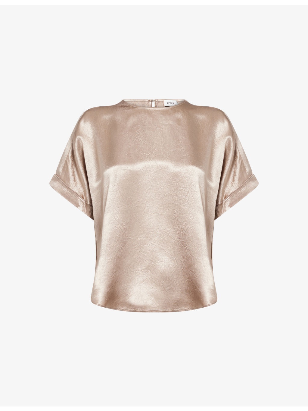 PRODUCT DETAILS - Simkhai satin top - 100% acetate - Button fastening at back - Round neck, short sleeves, side hem slit, all-over crinkle effect - Dry clean - True to size - Size small: length 21.2in / 54cm - Model is 5ft 10in/1.78m and wears a size small - Lightweight, non-stretch Ref: R04496786