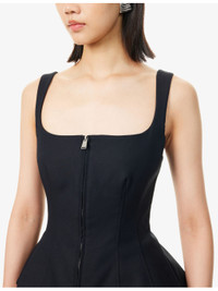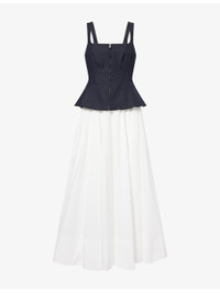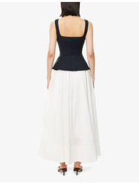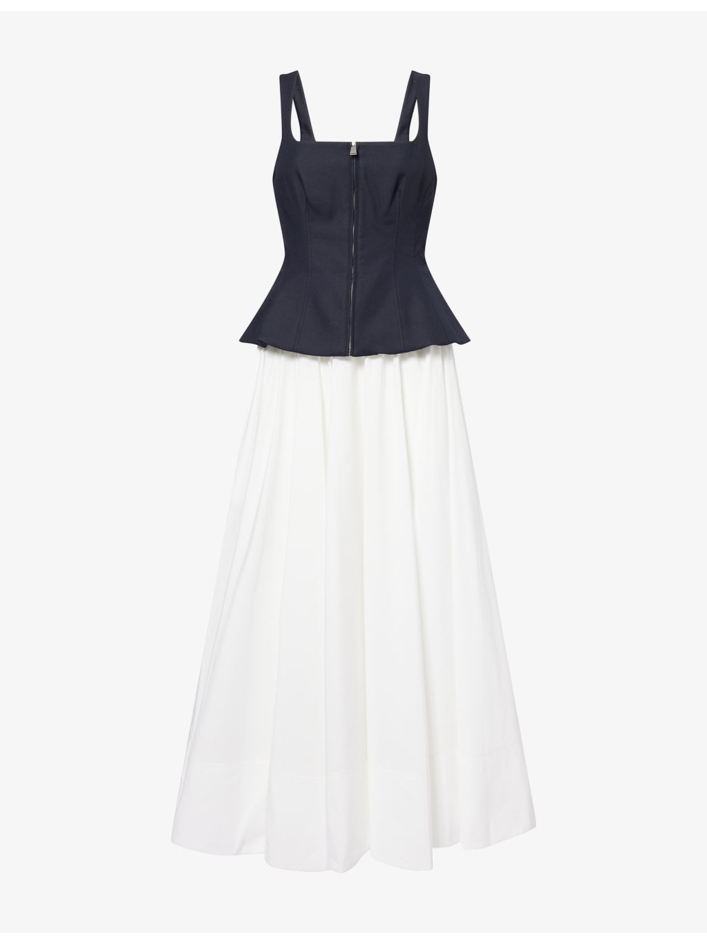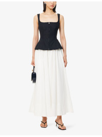 PRODUCT DETAILS - Simkhaiwoven midi dress - 59% nylon, 37% cotton, 4% Spandex; contrast 100% polyester; lining 100% cotton - Exposed zip fastening at front - Scoop neckline at front and back, sleeveless, peplum at hep, gathered skirt, lined - Dry clean - True to size - Size UK 8: length 55.1in / 140cm - Model is 5ft 10in/1.78m and wears a size UK 8 - Lightweight, non-stretch Ref: R04496771