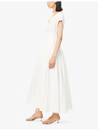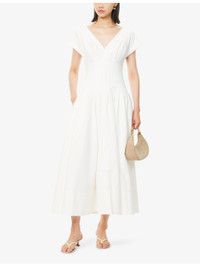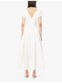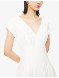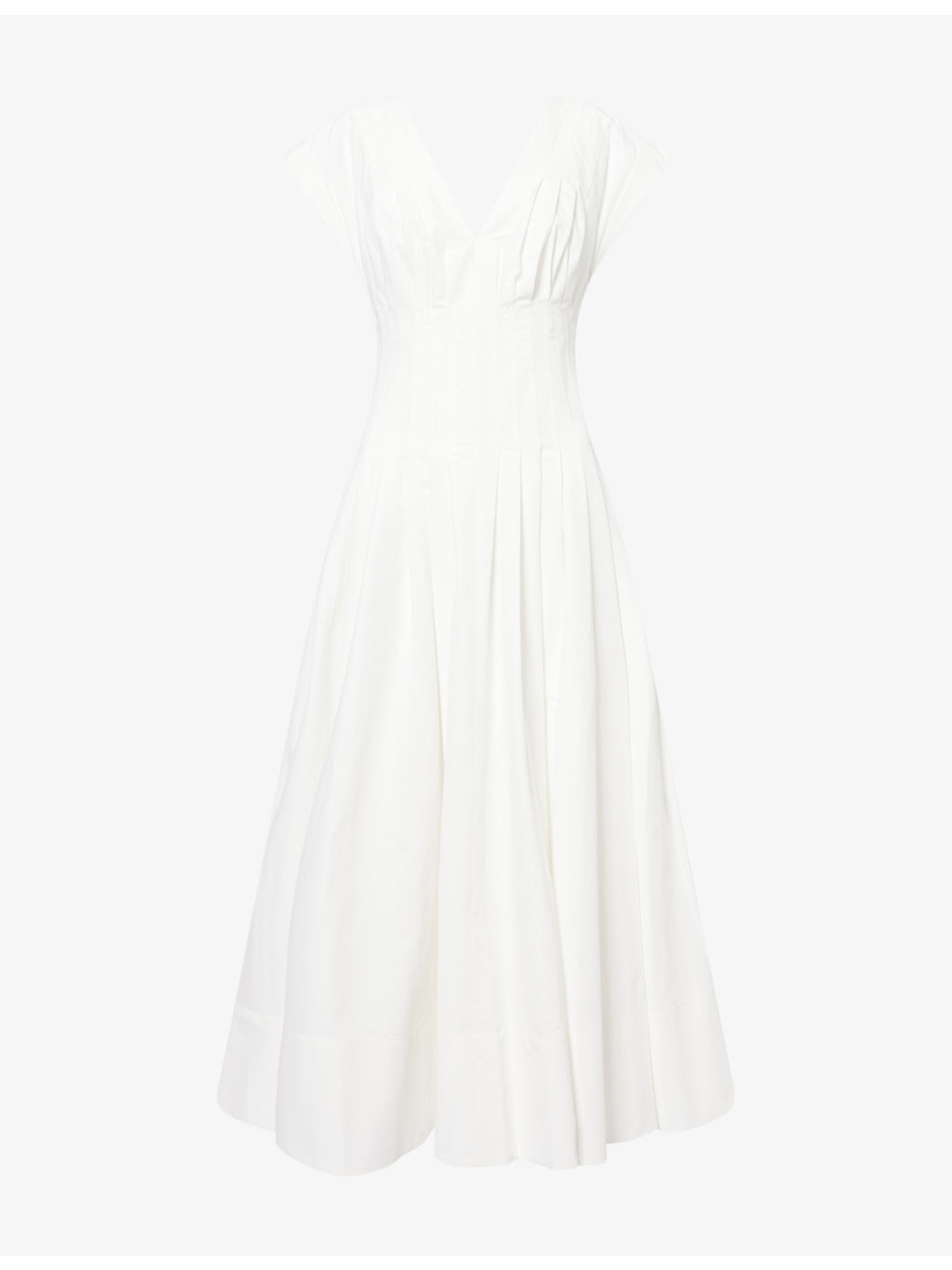 PRODUCT DETAILS - Simkhai cotton-blend midi dress - 62% cotton, 38% polyamide - Concealed zip fastening at back - V-neck opening, capped sleeves, fitted bodice, relaxed skirt, all-over pleated detailing, fully lined - Dry clean - True to size - Size UK 8: length 52.3in / 133cm - Model is 5ft 10in/1.78m and wears a size UK 8 - Lightweight, non-stretch Ref: R04496779