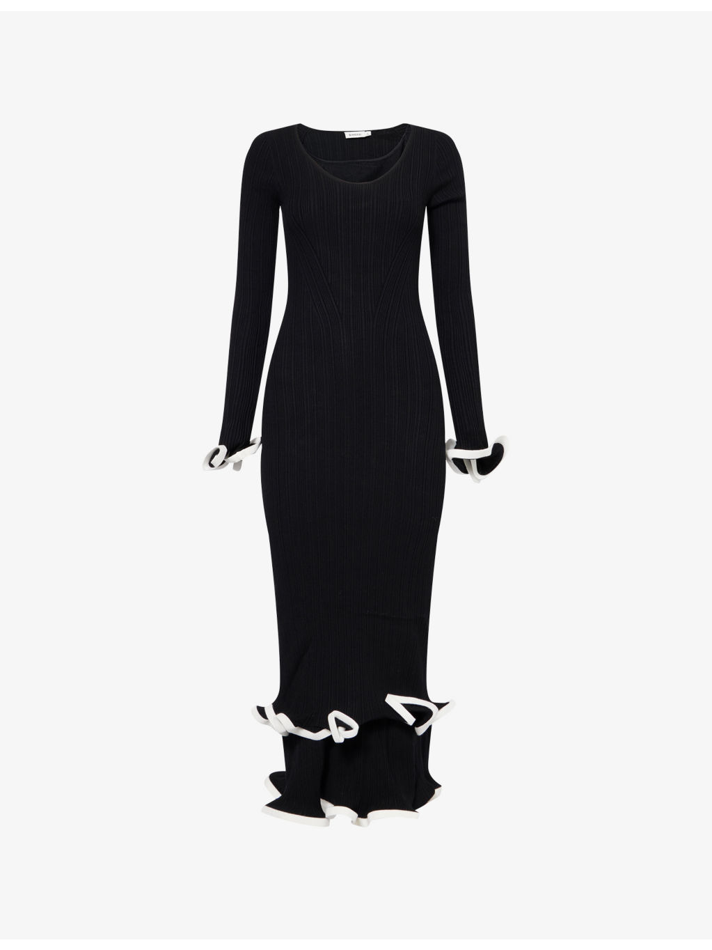 PRODUCT DETAILS - Simkhai knitted midi dress - 72% viscose, 28% polyester; lining 45% rayon, 38% viscose, 15% polyester, 2% nylon - Slim fit, scoop-neck, long sleeves, ruffled cuffs, all-over knitted and ribbed, double layer, contrast trims, structured ruffled hem - Dry clean only - True to size - Size small: length 54in / 138cm - Model is 5ft 10in/1.78m and wears a size small - Midweight, stretchy Ref: R04525466