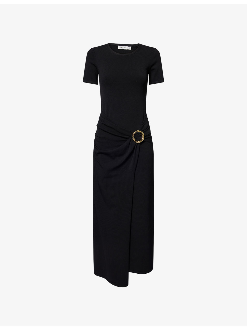 PRODUCT DETAILS - Simkhai knit midi dress - 71% viscose, 29% polyamide - Slim fit, scoop neck, short sleeves, draped panel at front, gold-tone hardware at front - Dry clean - True to size - Size small: length 51.5in / 131cm - Model is 5ft 10in/1.78m and wears a size small - Midweight, slight stretch Ref: R04496776