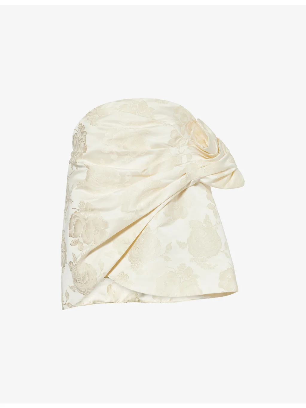PRODUCT DETAILS - Simone Rocha satin top - 100% polyester; lining 100% viscose - Concealed zip fastening at back - Regular fit, bandeau neckline, sleeveless, gathered sash and wrap-over at front, integrated boned bodice, all-over floral jacquard print, lined - Dry clean - Made in Portugal - True to size - Model is 5ft 10in/1.78m and wears a size UK 8 - Midweight, non-stretch Ref: R04584948