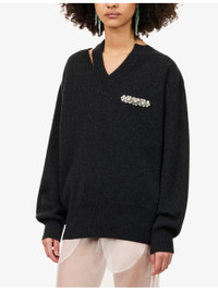 PRODUCT DETAILS - Simone Rocha merino wool-blend jumper - 93% merino wool, 6% polyamide, 1% elastane - Relaxed fit, v-neck, long sleeves, dropped shoulder, embellishment at chest, ribbed trims, split seam at neck and back - Hand wash - Made in Portugal - True to size - Model is 5ft 10in/1.78m and wears a size small - Midweight, stretchy Ref: R04584931