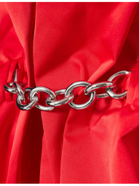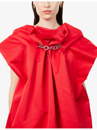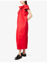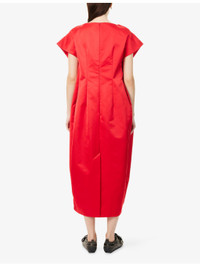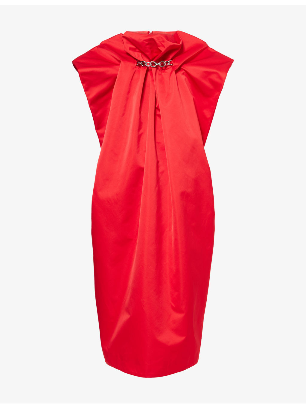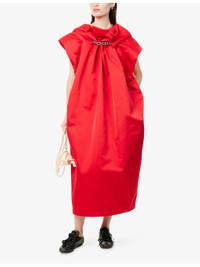 PRODUCT DETAILS - Simone Rocha woven midi dress - 100% polyester; lining 60% acetate, 40% cupro - Concealed zip fastening at back - Relaxed fit, asymmetric neckline, cap sleeves, chain embellishment and two slip pockets at front ruched, all-over satin texture, split at back, fully lined - Dry clean - Made in Portugal - True to size - Size UK 8: length 50in / 127cm - Model is 5ft 10in/1.78m and wears a size UK 8 - Lightweight, non-stretch Ref: R04486773