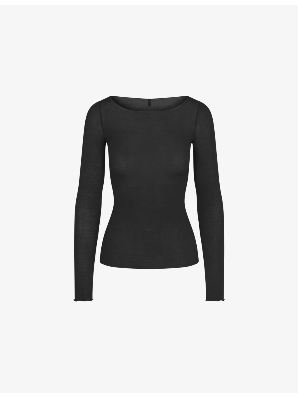 PRODUCT DETAILS - SKIMS stretch-modal T-shirt - 84% modal, 10% cashmere, 6% elastane - Slim fit, wide boat neckline, long exaggerated sleeves, sheer finish - Machine wash at 30°C - True to size - Model is 5ft 10in/1.78m and wears a size small - Lightweight, stretchy Ref: R04501689