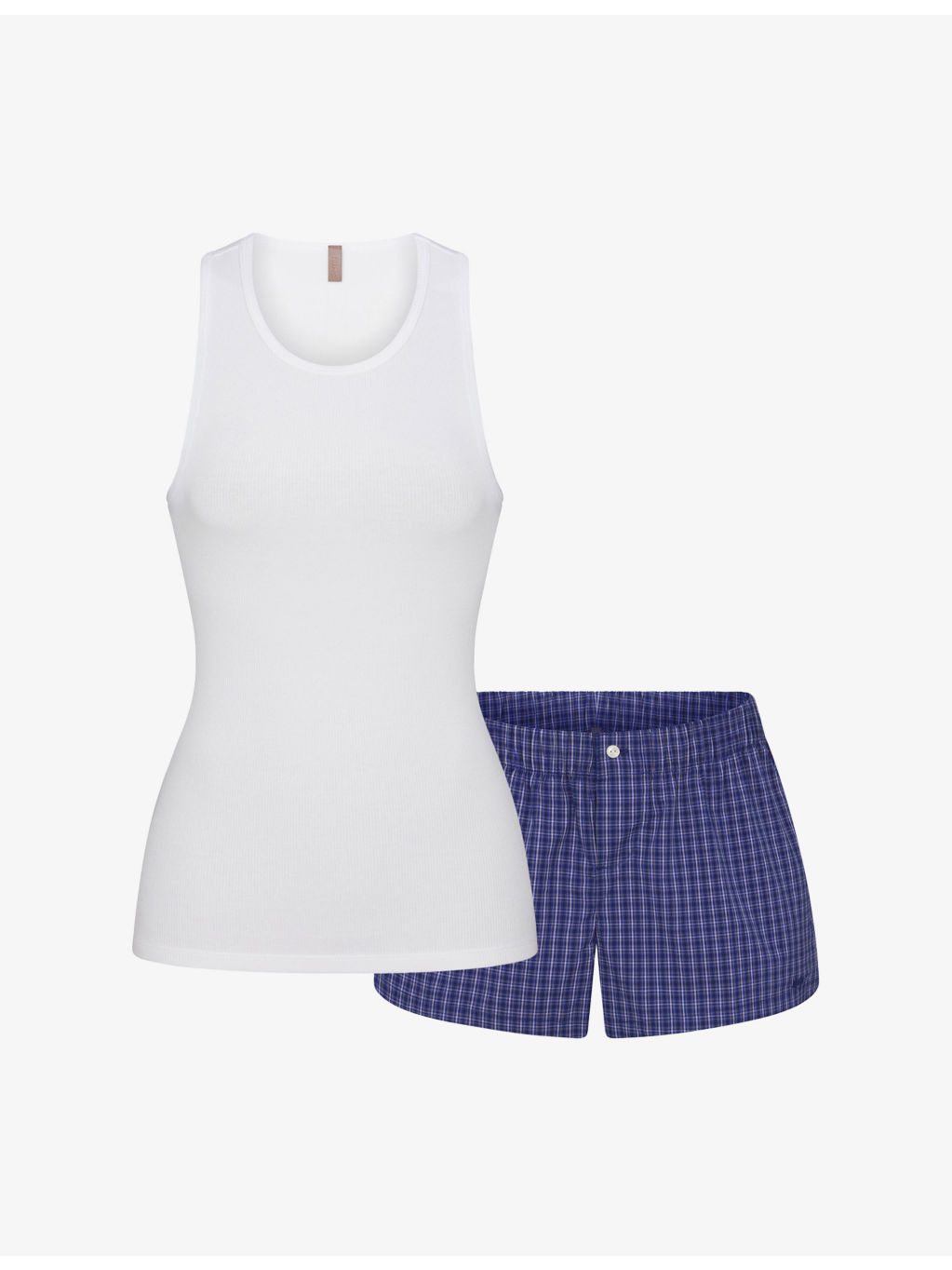 PRODUCT DETAILS - SKIMS stretch-cotton tank top and boxer shorts set - Top 95% cotton, 5% elastane; shorts 96% cotton, 4% elastane - Top: slim fit, high scoop neck, sleeveless, ribbed-knit texture - Shorts: exposed button-fly fastening at front, mid rise, elasticated waistband, all-over checked pattern, embroidered branding at leg, poplin texture - Machine wash cold - True to size - Model is 5ft 11in/1.80m and wears a size small - Lightweight, slight stretch Ref: R04501721