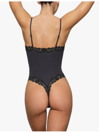 PRODUCT DETAILS - SKIMS stretch-woven body - 76% polyamide, 24% elastane - Slips on - Close fitting, scoop neckline, adjustable shoulder straps, lace trim at neckline and leg opening, lined gusset with snap closure - Machine wash mild - True to size - Midweight, stretchy Ref: R04247355
