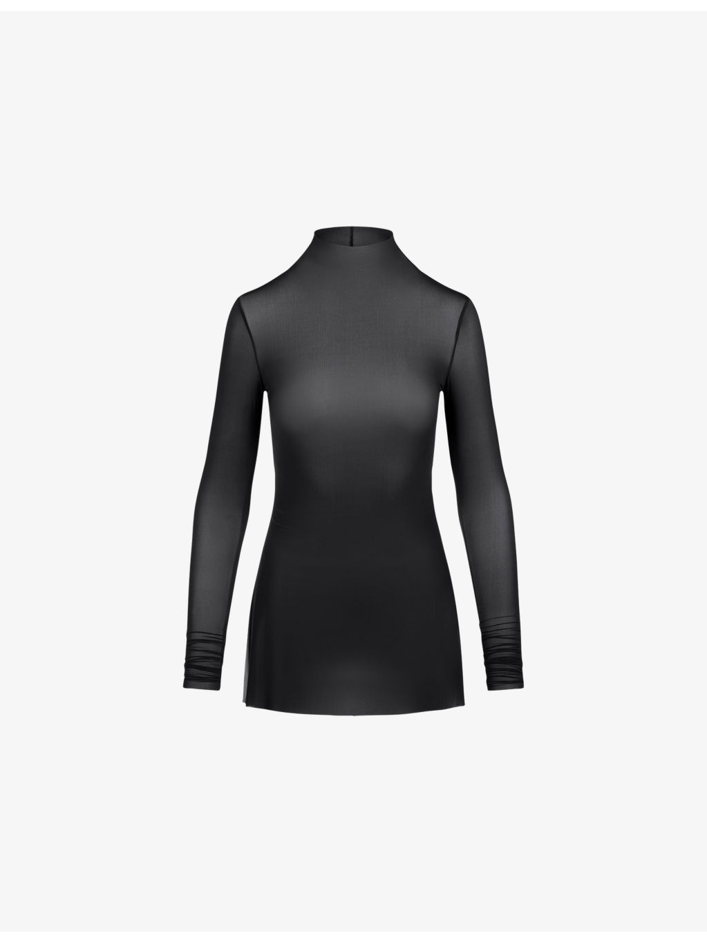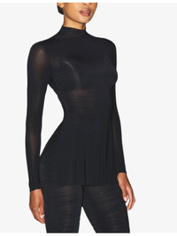 PRODUCT DETAILS - SKIMS jersey top - 56% polyamide, 44% elastane - Slim fit, mock neck, long sleeves, high side splits, jersey texture, sheer - Hand wash - True to size - Model is 5ft 10in/1.78m and wears a size small - Lightweight, stretchy Ref: R04468893