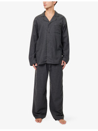 PRODUCT DETAILS - Skims cotton pyjamas set - 100% cotton - Button fastening at front - Top: exposed button fastenings at front, relaxed fit, camp collar, long sleeves, dropped shoulders, patch pocket at chest - Bottoms: relaxed fit, mid-rise, elasticated drawstring waistband, straight leg - Machine wash at 30°C - Model is 6ft 2in/1.88m and wears a size medium - Lightweight, non-stretch Ref: R04538451