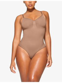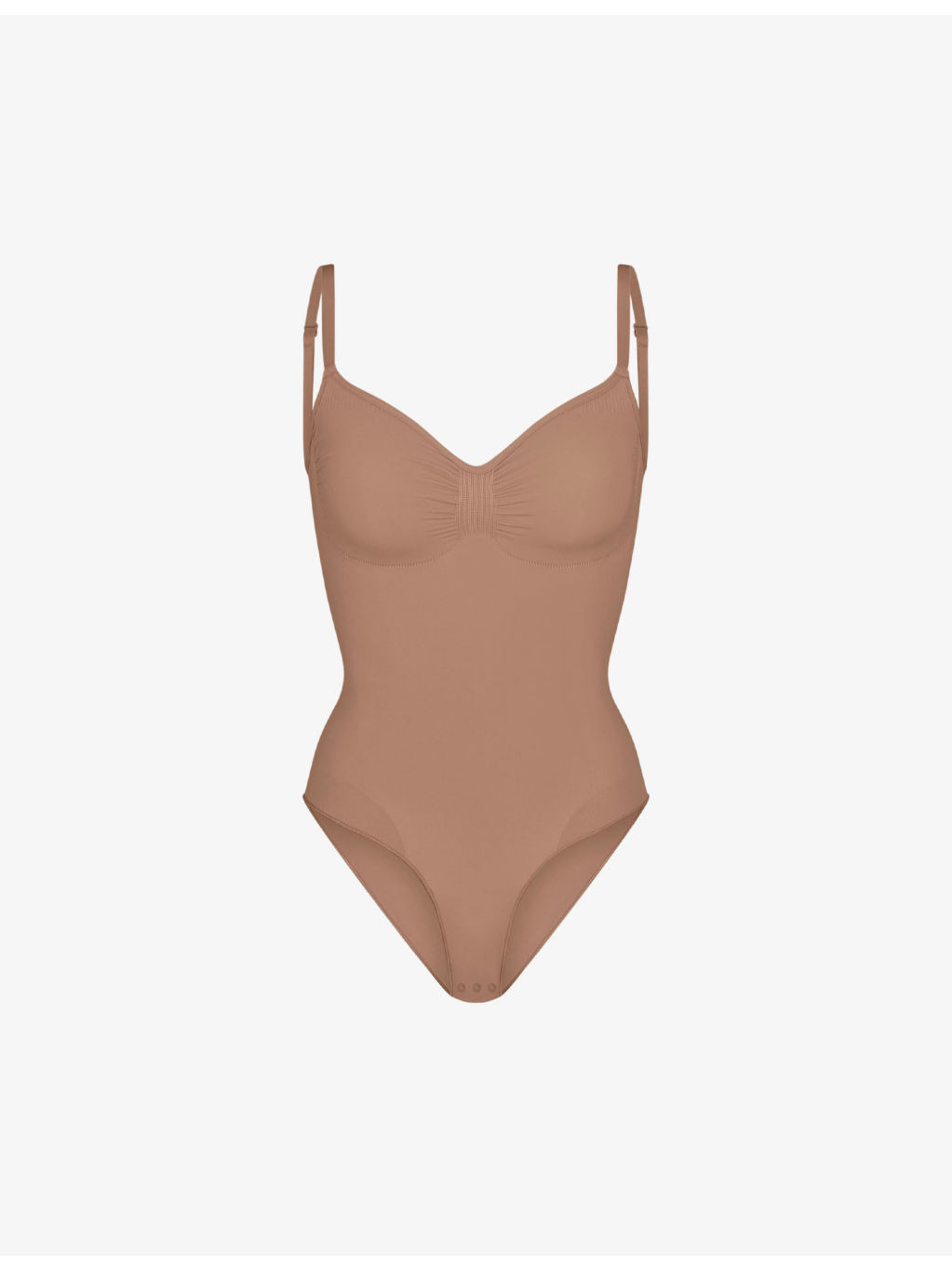 PRODUCT DETAILS - SKIMS stretch-woven body - 41% nylon, 41% recycled nylon, 18% elastane - Snap fastening - Fitted, seamless, scoop neck, ruched detail, adjustable straps - Machine wash cold - True to size - Lightweight, stretchy