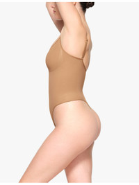 PRODUCT DETAILS - SKIMS fitted stretch-woven body - 82% nylon, 18% elastane - Slips on - Fitted, V-neck, sleeveless, ruched panel, low back - Hand wash cold - True to size - Lightweight, stretchy Ref: R04217492-S