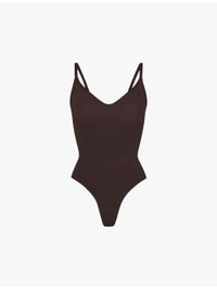 PRODUCT DETAILS - SKIMS fitted stretch-woven body - 82% nylon, 18% elastane - Slips on - Fitted, V-neck, sleeveless, ruched panel, low back - Hand wash cold - True to size - Lightweight, stretchy Ref: R04217492-S